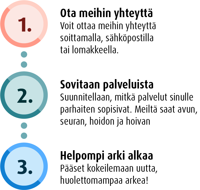 Palvelumme sopii kaikille, jotka tarvitsevat kotiinsa apua arjen onnistumiseen tai oman terveyden ylläpitämiseen. Kartoitamme ja sovimme yhdessä parhaan tavan toteuttaa palvelua juuri sinulle tai läheisellesi.